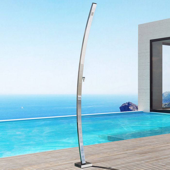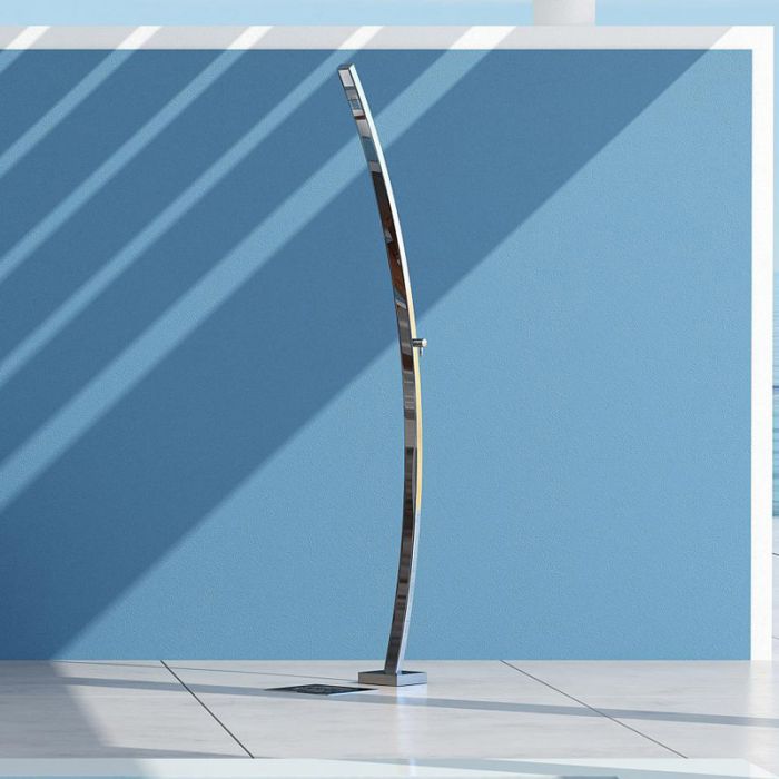 La doccia per piscina Motivo, coniuga il design minimale arcuato e la pregiata lucidatura a specchio per creare un oggetto architettonico che conferisce prestigio agli ambienti.